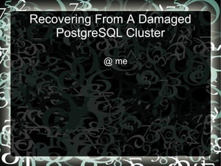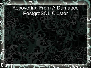 The document discusses recovering from a damaged PostgreSQL cluster. It provides examples of dropping and recreating indexes and sequences when files are corrupted. It also describes using single-user mode to rebuild system catalogs and vacuuming and reindexing tables in a database. Recreating the entire data cluster on another machine is recommended when significant damage occurs.