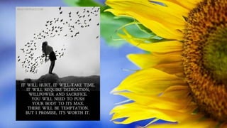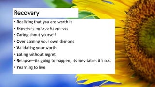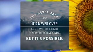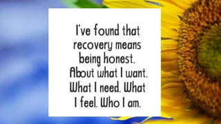 This document discusses various aspects of recovery from addiction or other struggles. It provides tips for recovery such as realizing your self-worth, overcoming demons, avoiding triggers, getting support from others, and not giving up despite possible relapse. Recovery is described as being worth it because the person is worth it. The 12 steps of addiction recovery and traditions of groups like AA are also outlined. Overall the document offers encouragement and guidance for people seeking recovery.