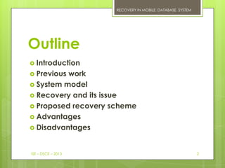 The document discusses recovery in mobile database systems. It outlines a proposed recovery scheme where the first base station a mobile user registers with in a region is designated as the base station for storing the user's log entries. When the user moves between regions, the designated base station transfers the log to the new region's designated base station, allowing for efficient recovery when failures occur. The scheme aims to reduce recovery time for mobile users.