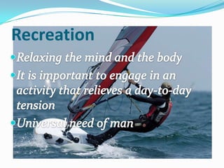 - Recreation involves voluntary activity that occurs during leisure time and provides benefits like physical and psychological health as well as social well-being.