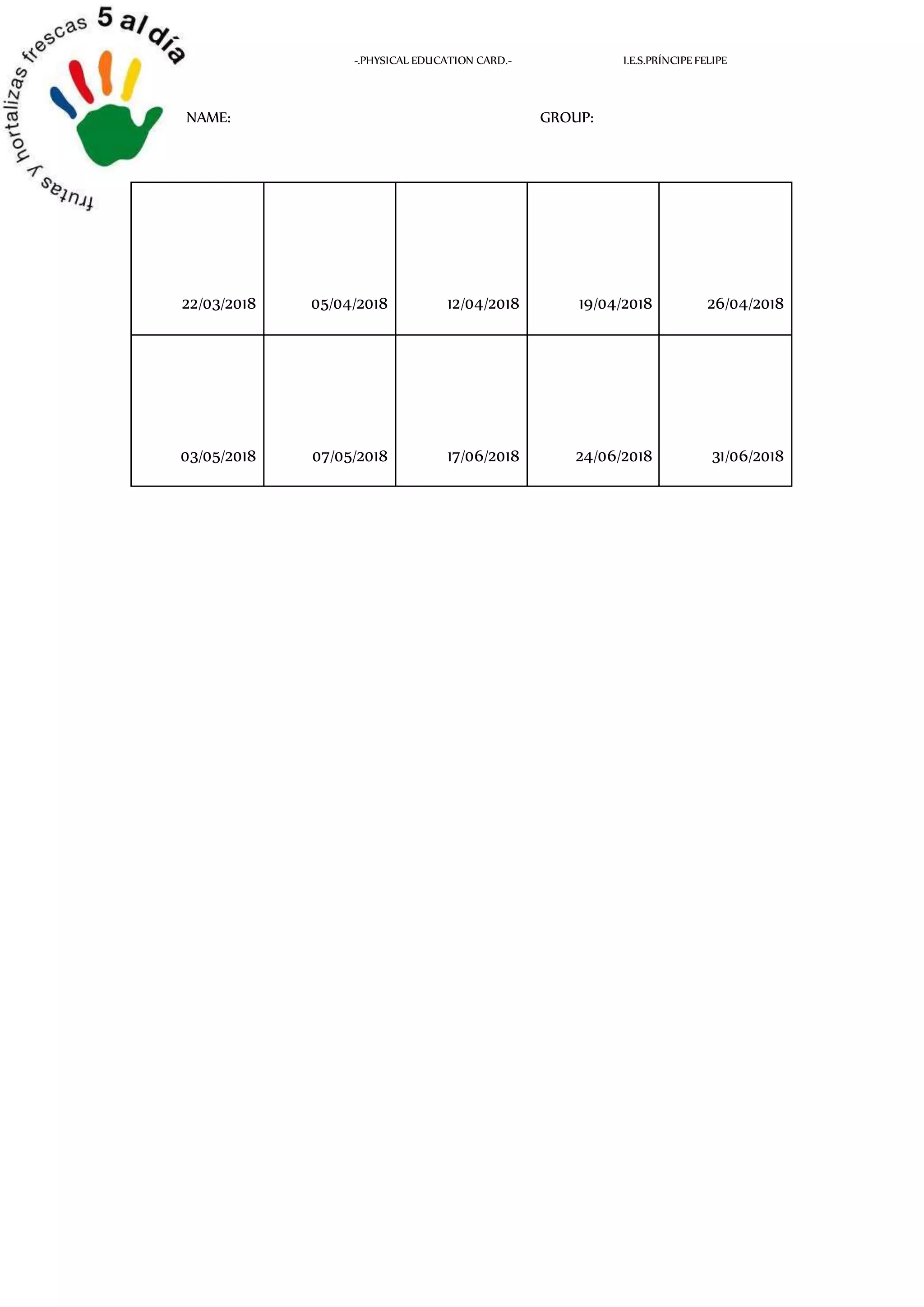 This physical education card from I.E.S. Príncipe Felipe tracks a student's attendance on various dates between March and June, with empty spaces to record whether they attended class on each date listed.