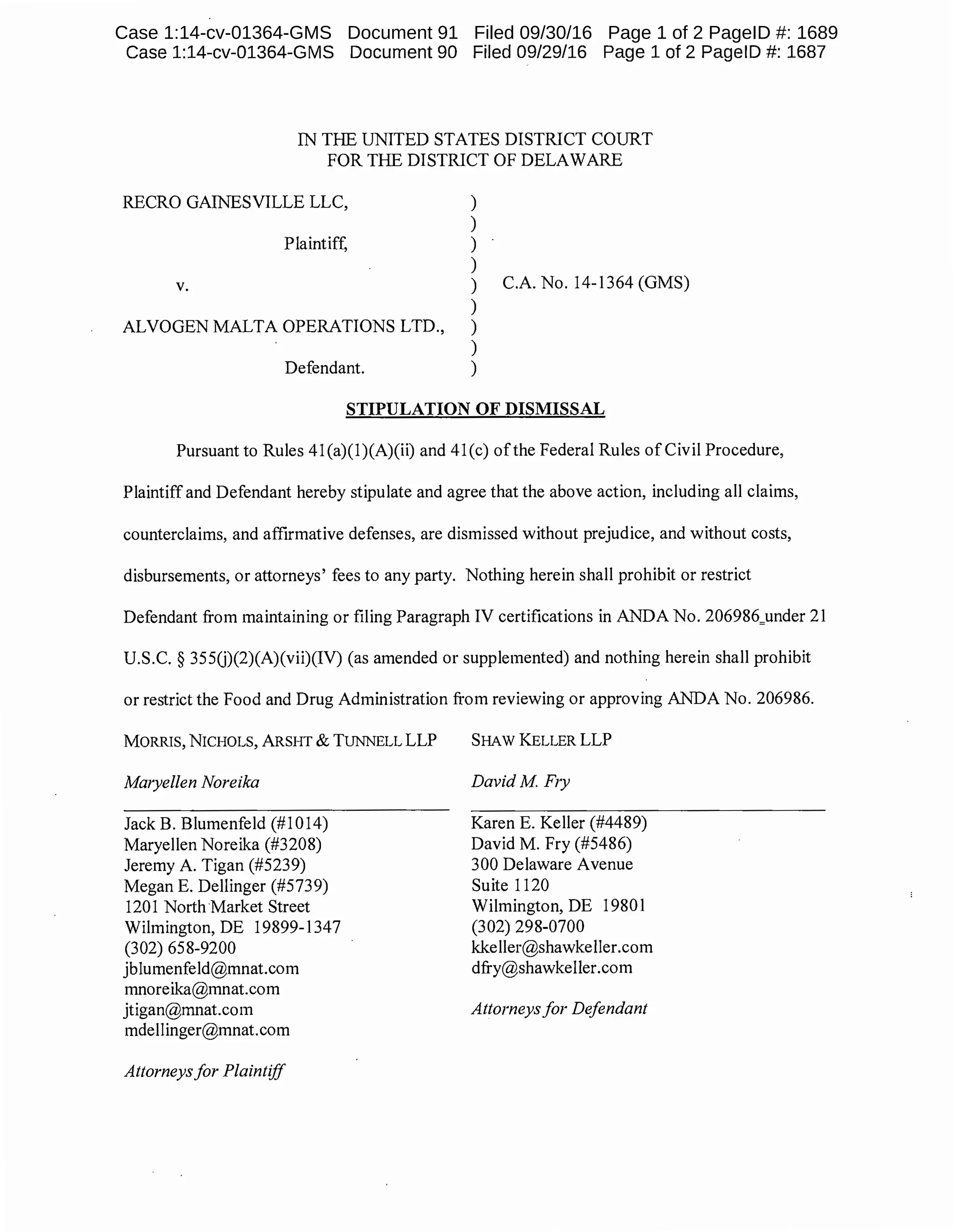 The parties stipulate to dismiss the case Recro Gainesville LLC v. Alvogen Malta Operations Ltd. without prejudice. The dismissal is pursuant to Rules 41(a)(1)(A)(ii) and 41(c) of the Federal Rules of Civil Procedure and without costs, disbursements, or attorneys' fees to any party. The stipulation also states that the dismissal shall not prohibit or restrict the defendant from maintaining or filing certifications for ANDA No. 206986 under relevant law nor prohibit or restrict the FDA from reviewing or approving that ANDA.