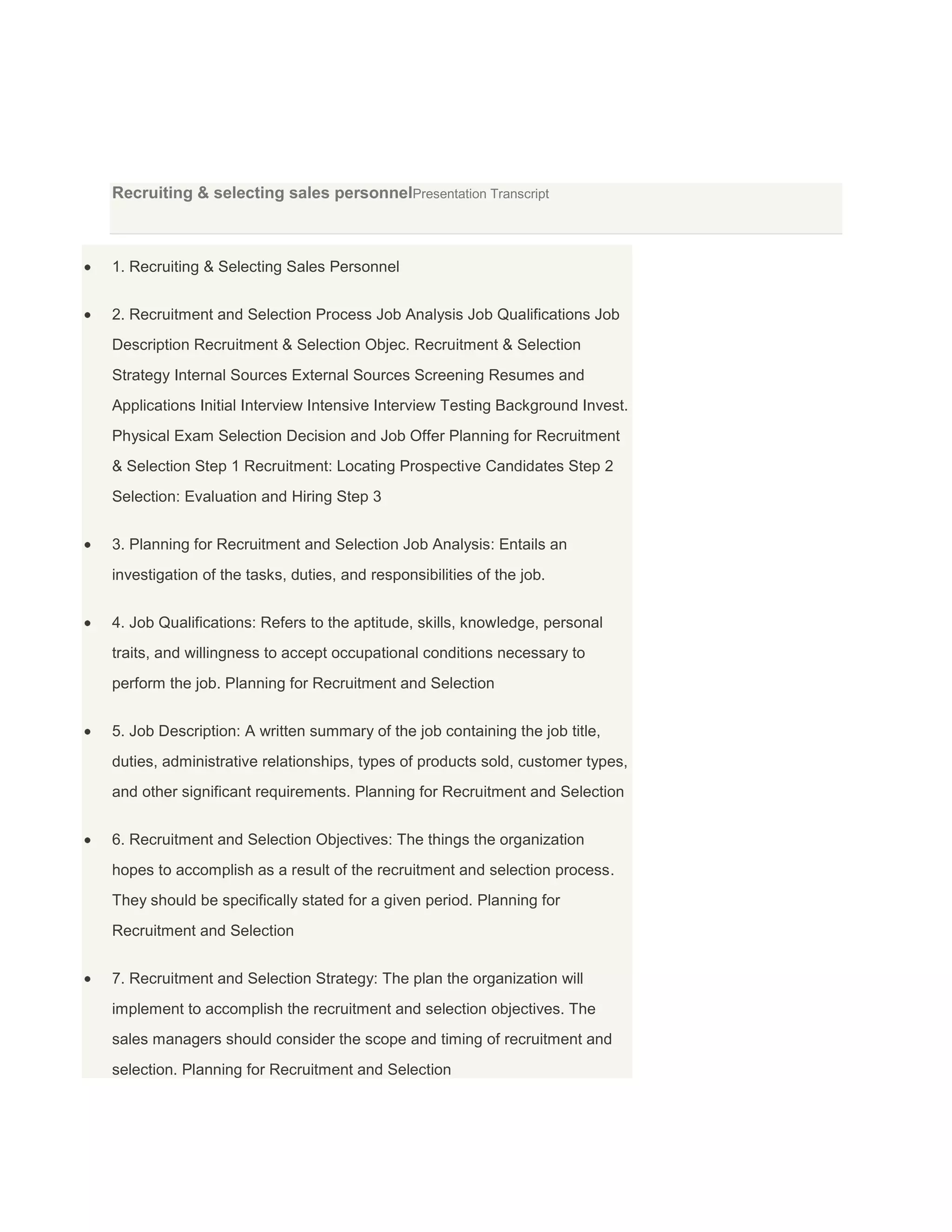 The document discusses the process for recruiting and selecting sales personnel. It involves several steps: 1) planning which includes job analysis to understand the role, defining qualifications and writing a job description, 2) recruitment by searching both internal and external candidates, 3) screening candidates by reviewing resumes, conducting initial interviews, and testing, 4) selection through intensive interviews, reference and background checks, testing, and potentially a physical exam, and 5) making a job offer to the selected candidate. The goal is to find the best qualified individuals who are a good fit for the sales role and organization.