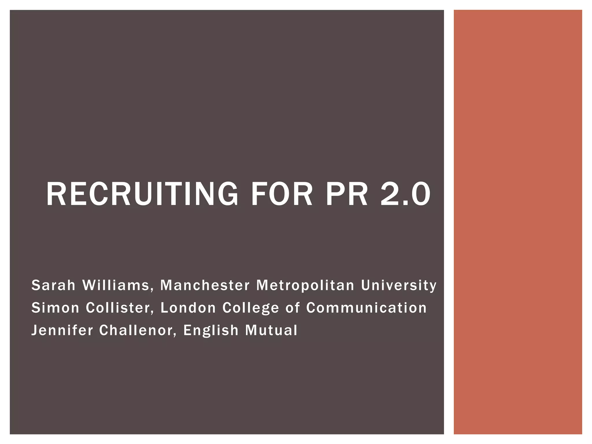 The document discusses how the rise of social media has impacted the practice of public relations. It conducted interviews with 8 PR practitioners to understand their perspectives on how social media has influenced their work. The findings showed that while practitioners reject the idea of completely "old" vs "new" skills, they see the transition to incorporate social media as steady rather than quick change. Practitioners also fear losing control with social media but see it as more of a tactical channel rather than strategic. The discussion examines how practitioners are maintaining traditional practices while also blurring boundaries between PR and other fields through social media. It concludes that practitioners favor a blended approach to PR rather than revolutionary changes.