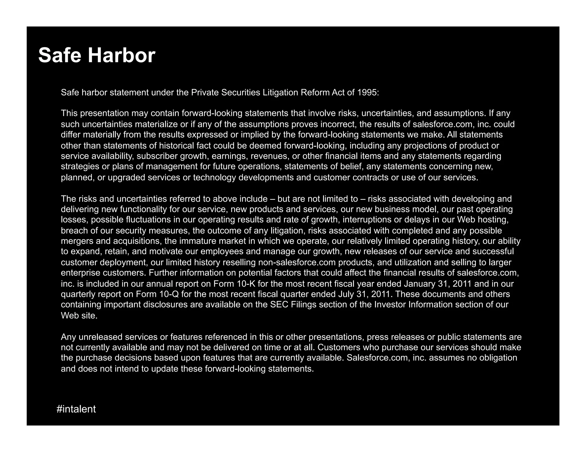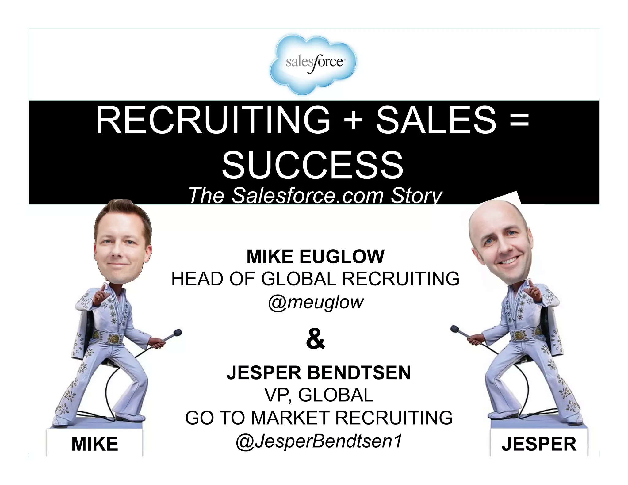The document outlines Salesforce's evolution and recruitment strategies from 1999 to 2012, illustrating a significant growth in employee headcount from 2 to 11,000. It emphasizes paralleling recruitment with sales processes, implementing new technology, and using data analytics to improve recruiting metrics and candidate experience. Key takeaways include the importance of building a sales-oriented organizational structure, investing in technology, and leading with data.