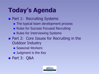 The document outlines strategies for recruiting and developing teams within the outdoor industry, emphasizing the importance of aligning hiring practices with organizational culture and defining success through clear job descriptions. Key components include behavioral interviewing techniques to assess candidates' cultural fit, competencies, and judgment, particularly for seasonal staff. The document concludes with a reminder for organizations to clearly communicate their values and expectations while maintaining high hiring standards.