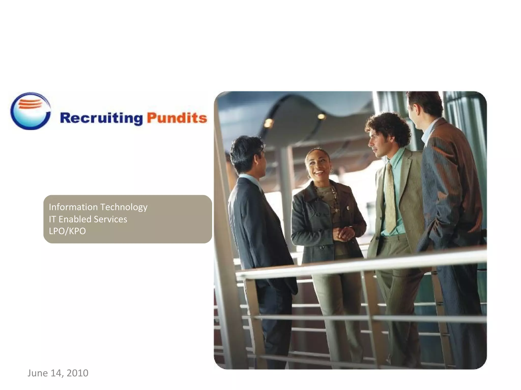 Recruiting Pundits is an HR services company offering recruitment process outsourcing, contingency recruitment, cross-border recruitment, and executive search. It was founded in 2005 by experienced recruitment professionals and has offices in India, Australia, and the US. The company has a proprietary database and provides a full talent acquisition process including defining requirements, identifying candidates, evaluating them, facilitating interviews, negotiations, and post-hiring integration.