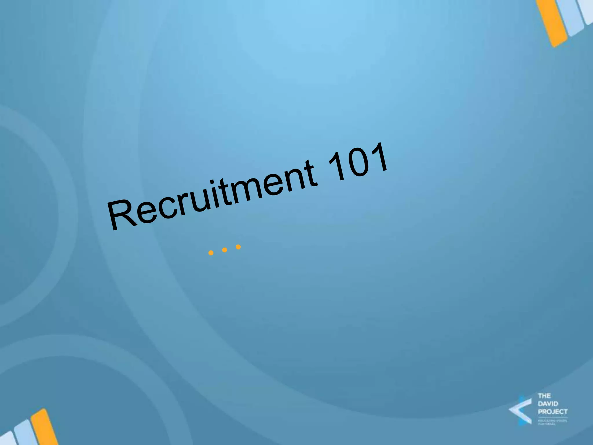 This document provides tips and strategies for effectively recruiting new members to a campus organization. It recommends understanding the campus and your group's identity before recruiting. Recruitment events can be formal, like a dinner, or informal, like coffee dates, to get to know recruits better. Tabling, networking, asking other groups, and engaging students are ways to get people to events. The goal is to understand recruits' interests and show how the group can meet their needs. Retaining recruits involves giving them responsibilities and input. Success is defined by engaged members, not just large numbers. Recruitment should be ongoing and can happen anywhere.