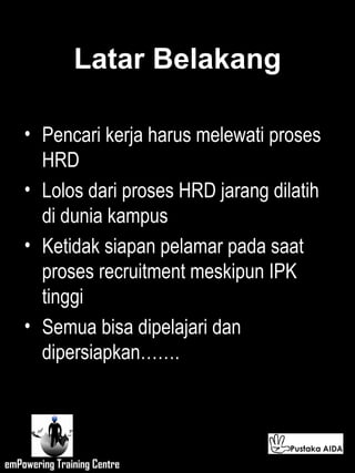 Dokumen tersebut memberikan tips dan panduan untuk mempersiapkan diri dalam proses rekrutmen dan seleksi HRD perusahaan. Beberapa hal penting yang disarankan adalah mempersiapkan lamaran kerja dan CV yang baik, mengetahui cara berinteraksi dengan interviewer, serta mempelajari berbagai tes yang mungkin dihadapi seperti tes tertulis, wawancara, dan kepribadian.