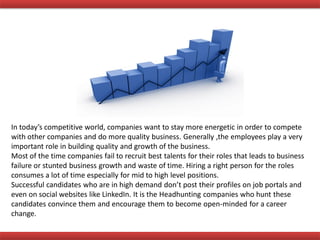 The document discusses headhunting in recruitment. Headhunting involves directly contacting and meeting with potential candidates, especially those not actively seeking new jobs, through networking events and references. It requires strong research skills to identify suitable passive candidates for senior roles. Headhunters must have excellent convincing and relationship-building abilities to persuade successful individuals to consider new opportunities. Companies hire headhunting firms to source top talent outside of traditional job boards that can improve business and client relationships.