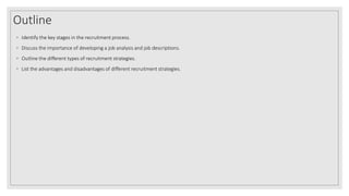 The document outlines the recruitment process as a critical component of human resource management, emphasizing the importance of job analysis and descriptions in attracting qualified candidates. It discusses the various recruitment strategies, their advantages and disadvantages, and the need for proper staffing plans and forecasting based on internal and external factors. Additionally, it highlights the significance of accurate job descriptions and the cost implications associated with different recruitment methods.