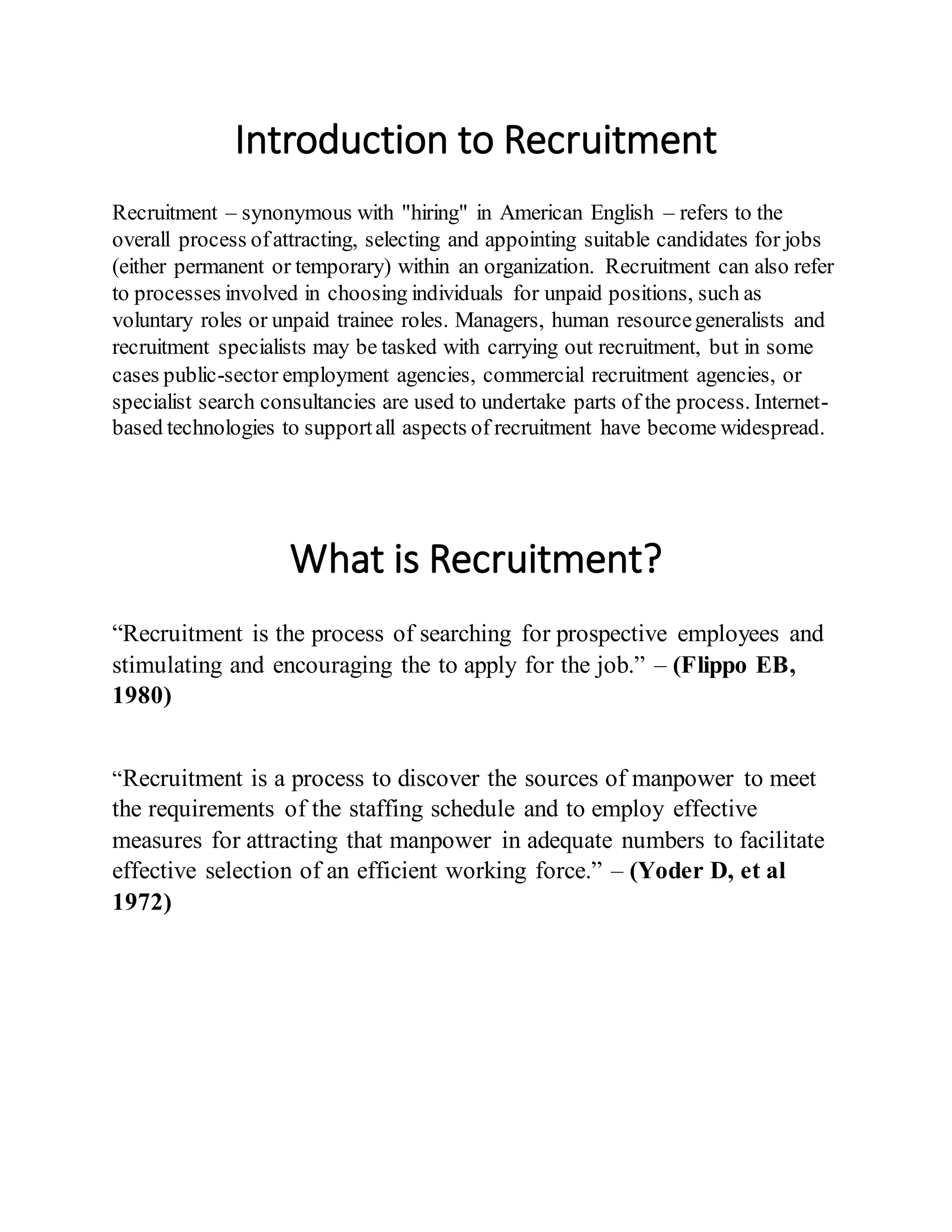 Recruitment refers to the process of attracting, selecting, and appointing candidates for jobs or unpaid positions. It involves locating and encouraging suitable candidates to apply. The recruitment process typically includes creating job requisitions, identifying internal and external candidate sources, communicating job information, encouraging applications, and evaluating effectiveness. Recruitment is affected by both internal factors like company size and policies, and external factors such as labor market conditions, unemployment rates, and legal considerations. The overall goal is to hire the best qualified candidates to fill positions and meet an organization's human resource needs.