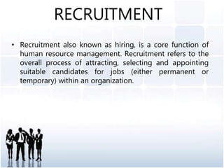 Recruitment is a core function of human resource management that involves attracting, selecting, and appointing candidates for positions within an organization. It can be categorized into internal and external recruitment, each with its own methods, advantages, and disadvantages. Internal recruitment utilizes existing employees for promotions, transfers, and referrals, while external recruitment involves hiring candidates from outside sources such as employment agencies and advertisements.