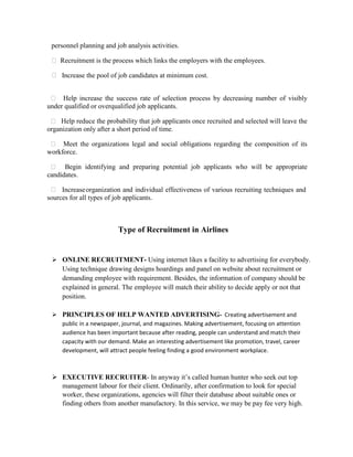 Recruitment refers to the process of finding and attracting job applicants. It is affected by both internal factors an organization can control, like its recruitment policies and human resource planning, as well as external factors outside its control, like the labor market and political environment. The recruitment process typically involves identifying a vacancy, developing a job description, locating candidates from sources like employee referrals, job boards, or colleges, screening applicants, interviewing candidates, and making a hiring decision.
