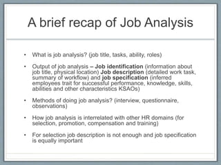 The document discusses recruitment and selection processes. It provides an overview of job analysis, including the purpose of job analysis and common methods used. Job analysis identifies job titles, tasks, requirements and characteristics needed for successful performance. Both qualitative and quantitative methods are discussed for conducting job analysis. The document also discusses task-oriented versus worker-oriented job analysis and competency modeling. It provides examples of competency frameworks and methods for developing competency models, including critical incident analysis and repertory grid analysis. Challenges with capturing competencies are also noted.