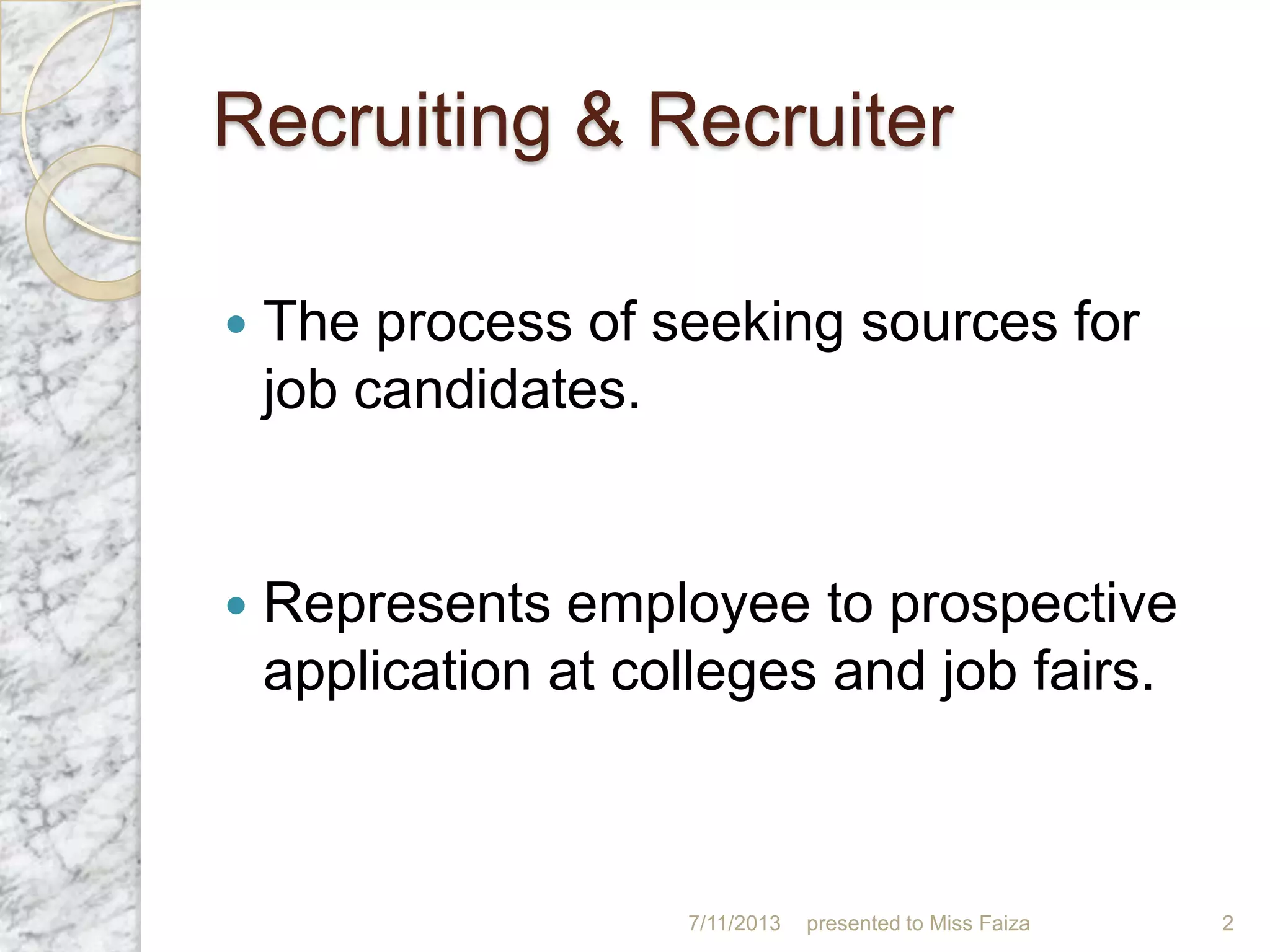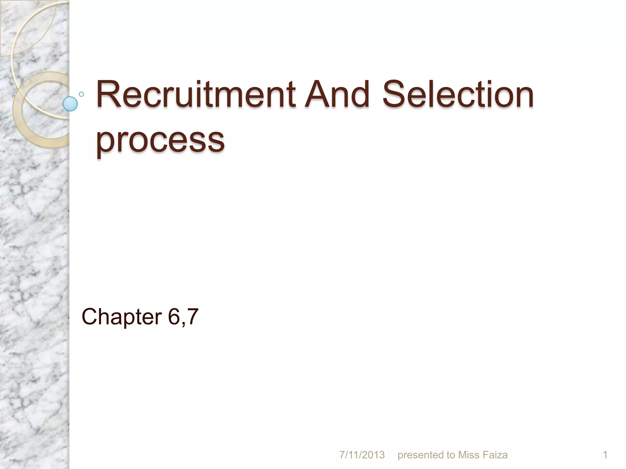 The document discusses the recruitment and selection process. It defines recruitment as searching for prospective employees and encouraging them to apply. The goals of recruitment are to obtain a sufficient number and quality of candidates to help the organization achieve its goals. The selection process involves screening applicants through methods like interviews, tests and background checks to choose the best candidate for hire. Common recruitment sources mentioned include referrals, job sites, newspapers and career fairs. The document also discusses reliability and validity in employee testing during selection.