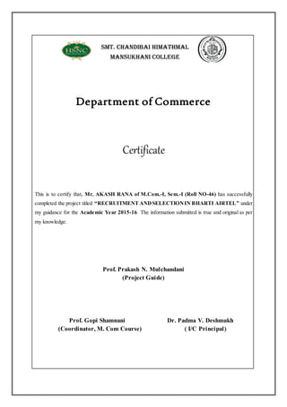 This document is a project report submitted by Akash Rana for his M.Com degree. It discusses recruitment and selection practices at Bharti Airtel, one of the largest telecommunications companies in India. The report provides an overview of Bharti Airtel, including its history, operations in 20 countries, vision, board of directors, and key business segments. It also outlines the regulatory structure for mobile services and broadband/telephone services in India. The project aims to analyze Bharti Airtel's recruitment and selection processes.