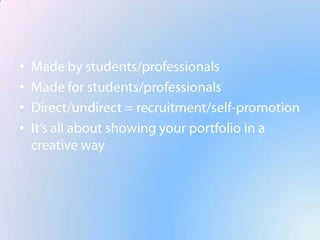 This document discusses several creative recruitment campaigns made by advertising agencies and schools to attract students and recent graduates. Some key examples mentioned are: