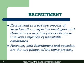 The document outlines the recruitment process, distinguishing between recruitment, which involves attracting candidates, and selection, which focuses on evaluating and choosing suitable applicants. It highlights various sources for recruitment, including internal transfers, promotions, and external methods such as advertisements, employment agencies, and recommendations. Additionally, it explains different recruitment methods, categorizing them as direct, indirect, and third-party approaches.