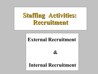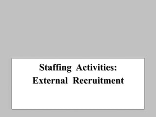 This document discusses recruitment planning and activities. It covers organizing recruitment internally or through external agencies, developing recruitment strategies, choosing appropriate recruitment sources, crafting effective recruitment messages, and transitioning applicants to the selection process. Recruitment planning involves considering administrative issues like requisitions and budgets, as well as selecting and training recruiters. The goal is to efficiently fill jobs with quality applicants through well-executed recruitment.
