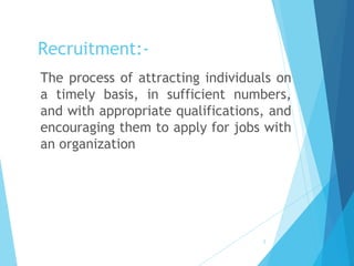 This document discusses recruitment and the recruitment process. It begins by defining recruitment as attracting qualified individuals in sufficient numbers through various methods. It then discusses internal recruitment methods like job postings and employee referrals. Next, it describes the role of an internal recruiter in handling various recruitment activities. The document outlines the recruitment process including job analysis, sourcing candidates, selection methods, and key metrics to track like time-to-hire and cost-per-hire. It also discusses recruitment strategy, sources, and methods both internal and external to the organization.