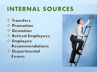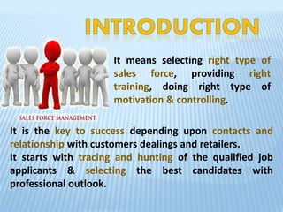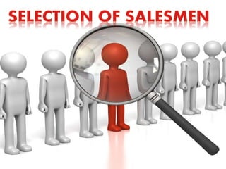 The document discusses the process of recruitment and selection of sales force. It involves identifying qualified candidates through sources like internal promotion or external hiring. The selection process consists of application screening, interviews, tests, reference and background checks and making a final job offer. Key steps include creating a hiring profile, evaluating applications, conducting structured and informal interviews, administering psychological and ability tests, checking references, conducting medical examinations and placing the selected candidates in suitable job roles. The overall goal is to recruit and select the best suited individuals for the sales jobs through a detailed process.