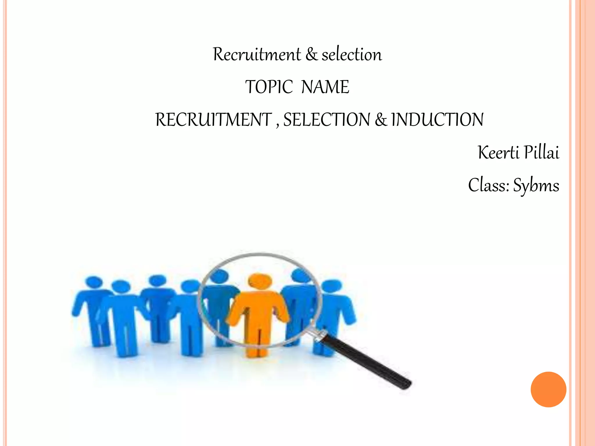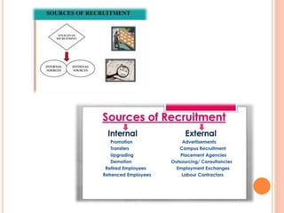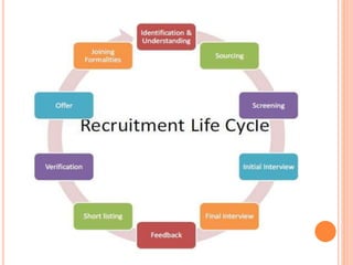 Recruitment, selection, and induction are important processes for hiring and onboarding new employees. Recruitment involves finding potential candidates, selection determines the most suitable candidates through tests and interviews, and induction introduces new hires to the organization. The goal is to attract qualified applicants and choose individuals who are the best fit for open roles to improve organizational performance through scientific selection processes and proper placement of employees.