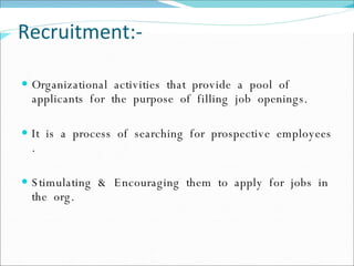 The document discusses recruitment, selection processes, and psychological testing used in hiring. It covers the key steps in recruitment including identifying job requirements, attracting candidates, screening applications, interviews and assessments. Selection methods like testing, interviews and background checks are explained. The uses, types, advantages and disadvantages of psychological testing in selection are also summarized.