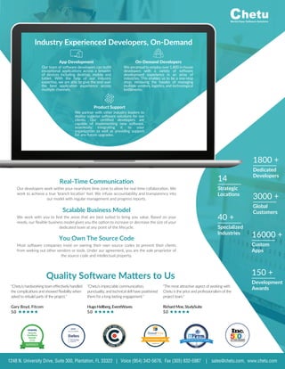 This document summarizes Chetu's custom applicant tracking system (ATS) and recruitment software solutions. Chetu offers custom development of ATS software to streamline recruitment workflows and leverage existing HR systems. They also integrate with third-party ATS providers. Chetu develops custom modules for interview scheduling, candidate relationship management, and recruitment analytics reporting. They employ over 1,800 developers across specialized industries to provide on-demand app development and long-term product support.