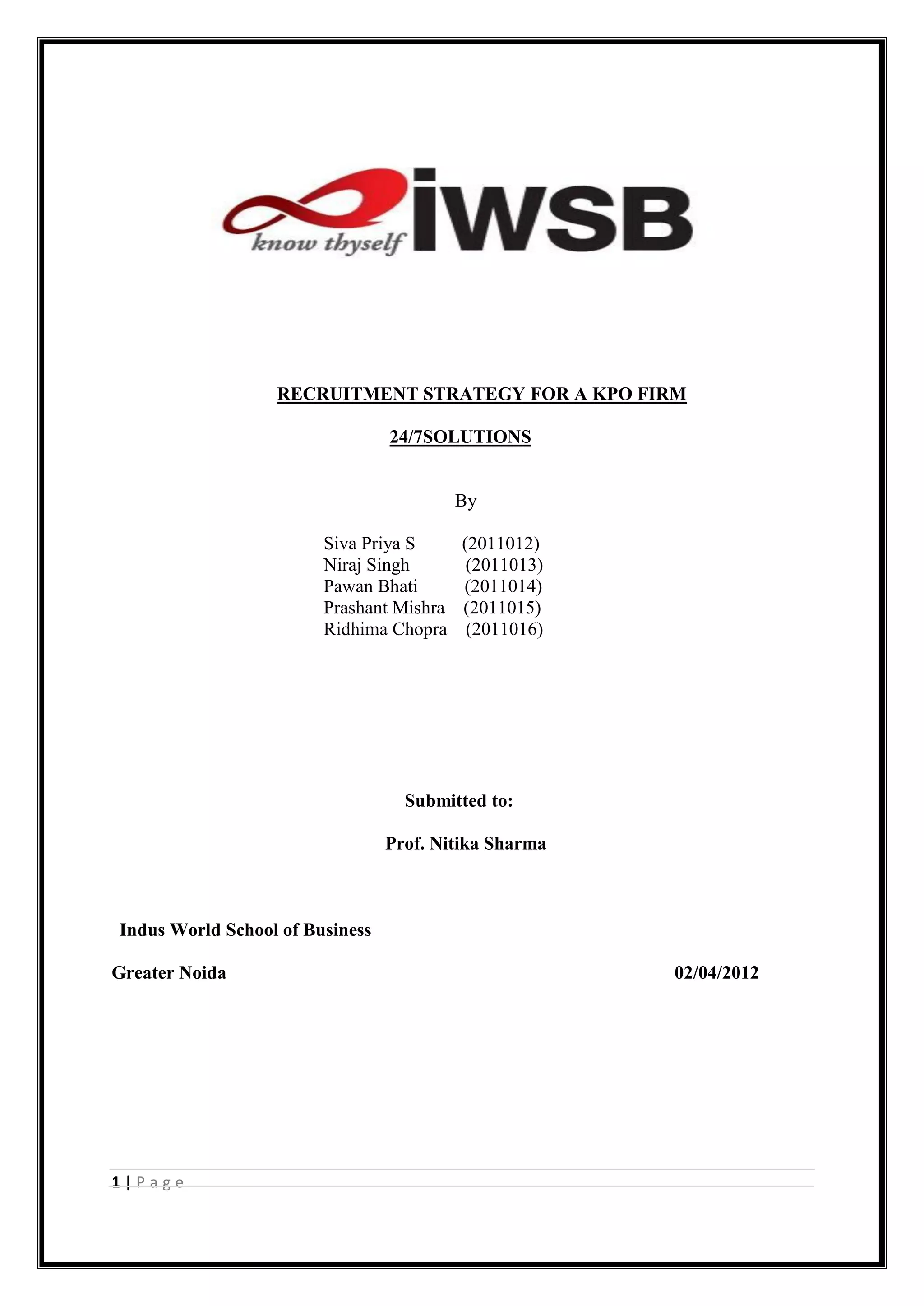 The document provides a recruitment strategy for a Knowledge Process Outsourcing (KPO) firm. It outlines assumptions about the firm's staffing needs and discusses both internal and external recruitment methods. For frontline roles, the strategy recommends external recruitment through job portals and consultants to access a large candidate pool. Internal promotion and external hiring through consultants are suggested for supervisor roles. The document also provides sample job descriptions for frontline and manager roles at the KPO firm. It discusses utilizing both internal referrals and external sources like headhunters to fill manager positions.