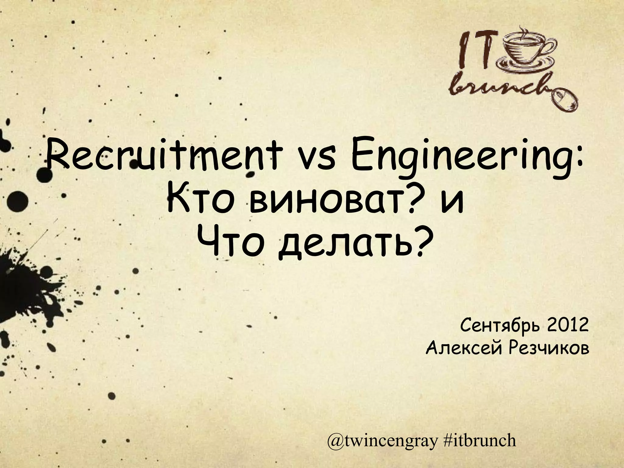Документ обсуждает проблемы в области рекрутинга и инженерии в IT, подчеркивая нехватку кадров и ответственность всех участников процесса. Автор, опытный разработчик и консультант, призывает к командной работе и улучшению коммуникации между рекрутерами и инженерами. В заключении отмечается необходимость адаптации бизнеса к быстро меняющимся условиям рынка.