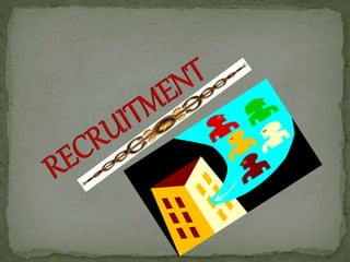 The document discusses various aspects of the recruitment and selection process. It begins by defining recruitment as the process of finding and hiring qualified candidates for jobs. It describes the typical stages of recruitment from seeking applicants to evaluating applications. It then discusses factors that influence recruitment strategies like business size, compensation, and past recruiting policies. The document also outlines a recruitment policy framework and common recruitment sources. It defines selection as the process of choosing the most suitable candidates. The typical selection stages are then outlined such as screening applications, interviews, and approval. The document concludes by discussing placement, orientation, and credentials.