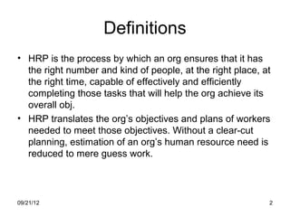 The document discusses human resource planning and management. It defines HRP as ensuring the right number and type of employees are available at the right times to help the organization achieve its goals. Effective HRP includes forecasting labor demand and supply to anticipate surpluses or deficits. It also aims to attract and retain qualified employees while developing a flexible workforce. Factors like organizational strategy, growth, and the external environment impact HRP. Forecasting methods and programs can help address expected labor shortages or surpluses.