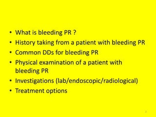 1) The document provides information on the evaluation and management of bleeding per rectum (BPR). It discusses the history, physical exam, differential diagnoses, investigations and treatment options for common causes of BPR.