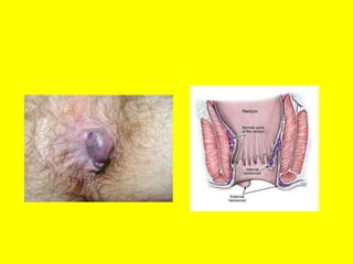 3) Physical exam involves digital rectal exam to feel for masses or other abnormalities. Initial investigations include labs, endoscopy, and imaging. Treatment depends on the underlying cause but may include medications, procedures like banding or surgery.