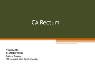 This document discusses a case of a 60-year-old male diagnosed with rectal cancer. It provides details on his medical history, including a sigmoidoscopy that revealed adenocarcinoma of the rectum. He received neoadjuvant chemoradiation therapy. The document discusses the clinical anatomy of the rectum, risk factors for rectal cancer, staging systems, diagnostic workup, and treatment options like surgery. The main treatment is surgery, with the goal of total mesorectal excision to reduce local recurrence rates.