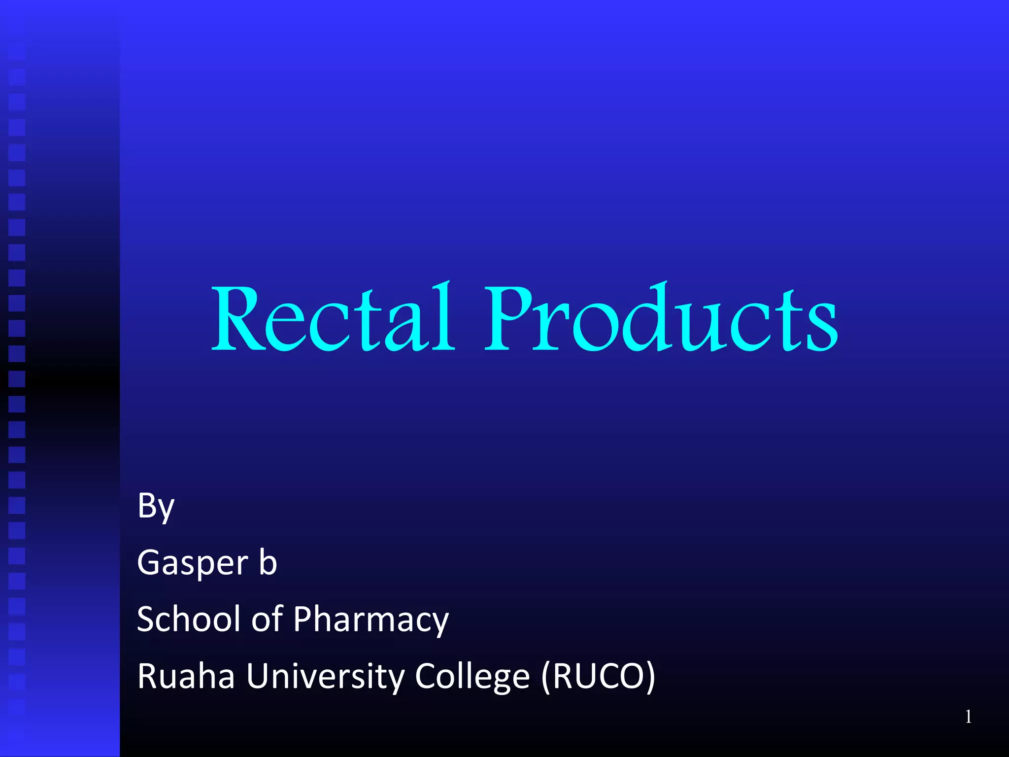 This document discusses rectal products and suppositories. It begins by defining rectal products as pharmaceutical preparations administered via the rectum for local or systemic effects. It then discusses the advantages and disadvantages of the rectal route of drug administration. Specific rectal products discussed include suppositories and enemas. The document provides details on the anatomy and physiology of the rectum and factors influencing drug absorption from the rectum. It describes the ideal properties of suppository bases and discusses commonly used bases such as cocoa butter and synthetic triglycerides.