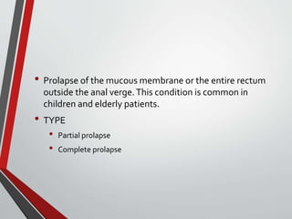 This document discusses rectal prolapse, which is the protrusion of the rectum outside of the body. It describes the types of rectal prolapse as partial or complete. Risk factors include weakened muscles, trauma from childbirth, and conditions that increase abdominal pressure. Treatment depends on the type and severity of prolapse, ranging from injections to repair surgery via abdominal or perineal approaches. Complications of surgery include nerve damage, infection, and recurrence of prolapse.