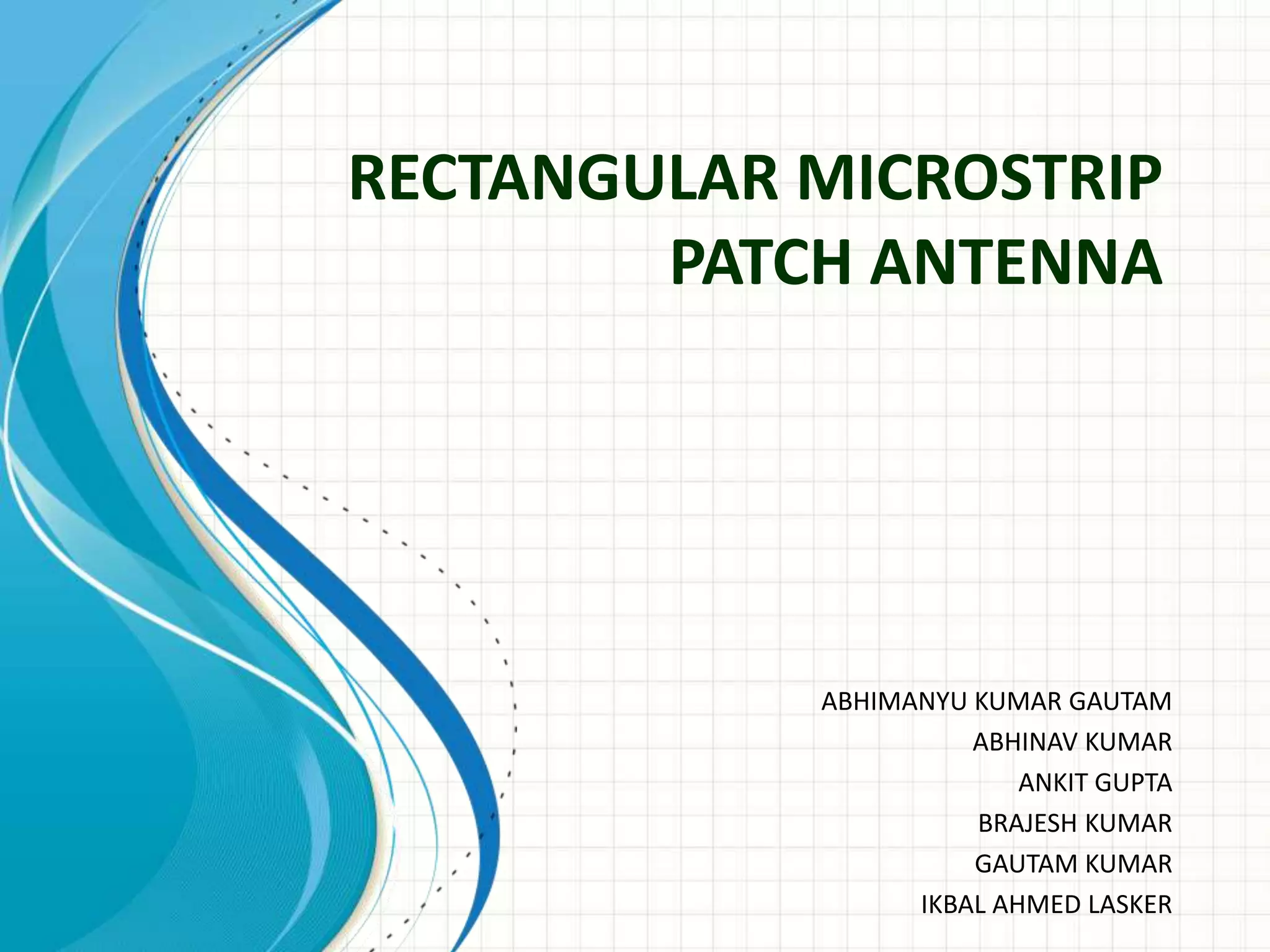 This document describes the design and analysis of a rectangular microstrip patch antenna. It discusses the fundamental parameters of antennas, defines a microstrip patch antenna and its properties. It then details the design specifications for the rectangular patch, including its 3D modeling in HFSS software. The results of simulating the patch antenna in HFSS are presented, including S-parameters, radiation patterns and far field reports. Advantages and disadvantages of microstrip patch antennas are listed, along with their applications. The conclusion discusses achieving better return loss, gain and efficiency for the designed patch antenna.