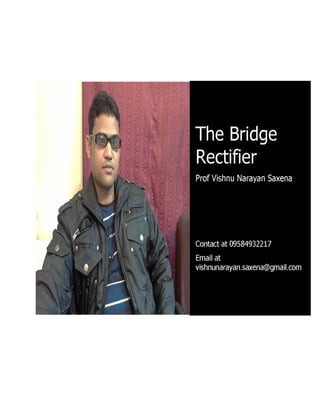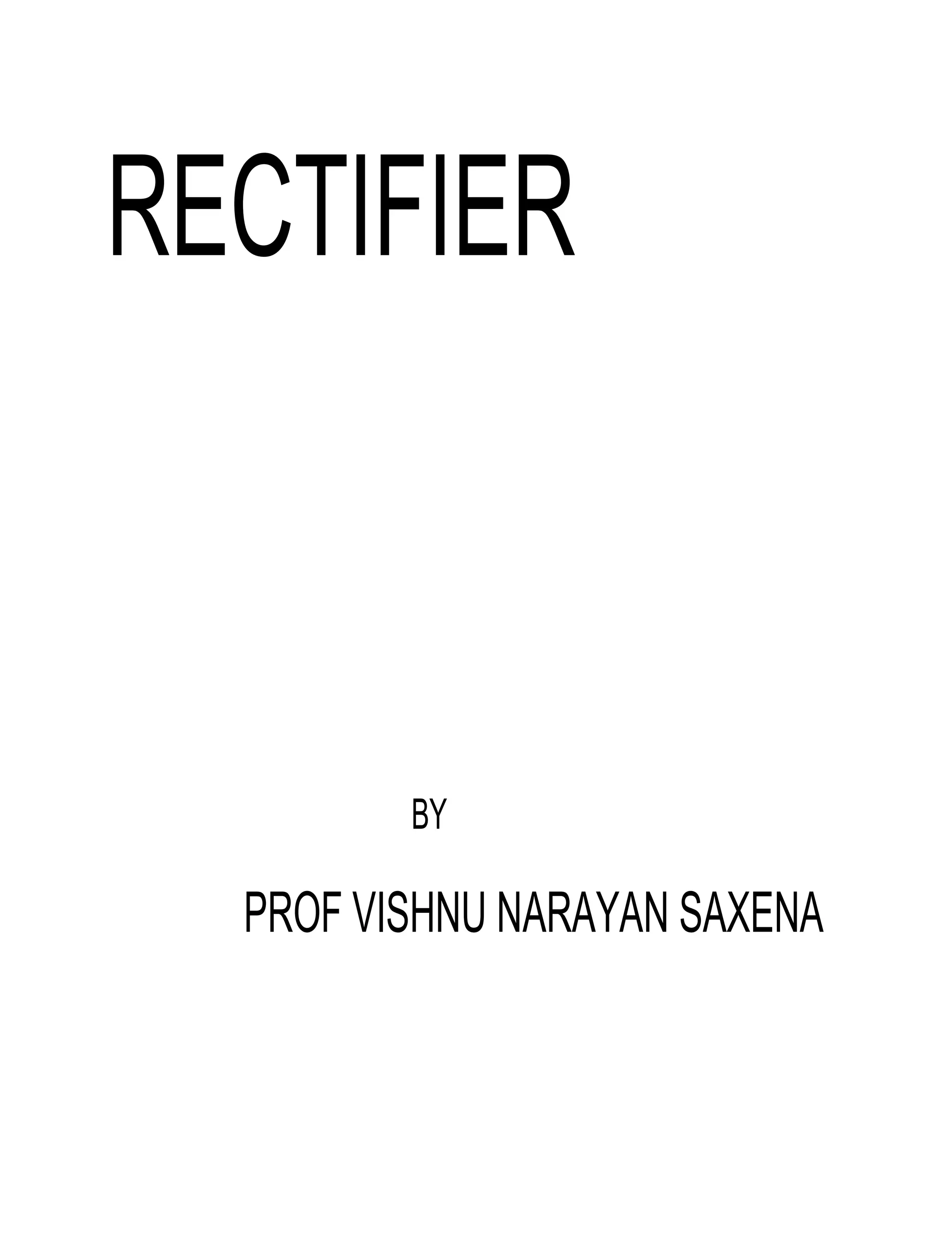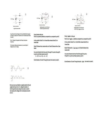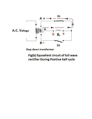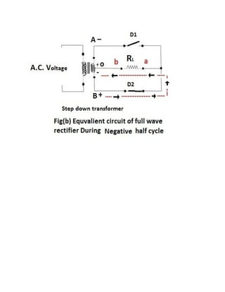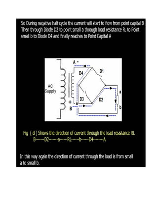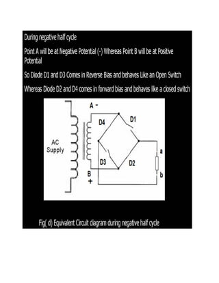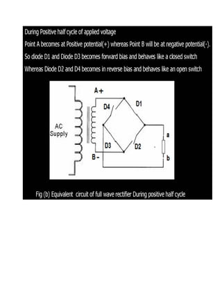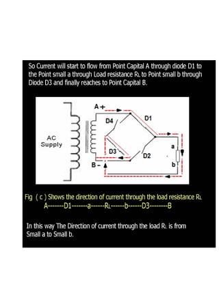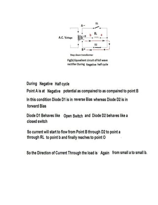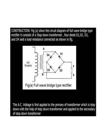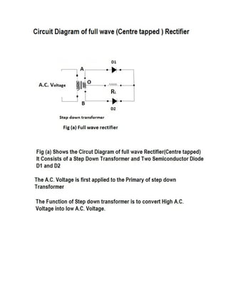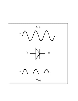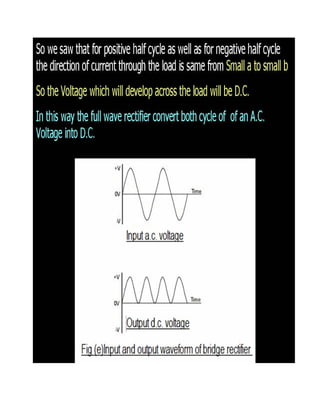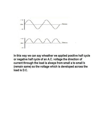 This document discusses rectifiers, which are devices that convert alternating current (AC) to direct current (DC). It explains that AC current periodically changes direction, while DC current flows in one constant direction. A rectifier uses diodes, semiconductor devices that only allow current to flow in one direction, to filter the negative portions of the AC waveform. It describes half-wave rectification, where one diode only passes the positive half of the AC cycle, producing pulsing DC voltage. Full-wave rectification is also mentioned, using two diodes in a center-tapped transformer configuration to pass both halves of the AC cycle and produce less pulsing DC voltage.
