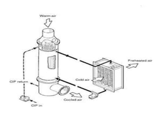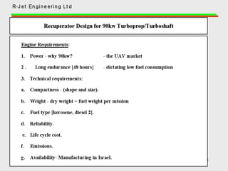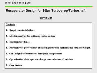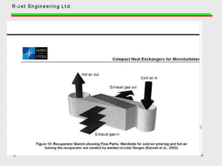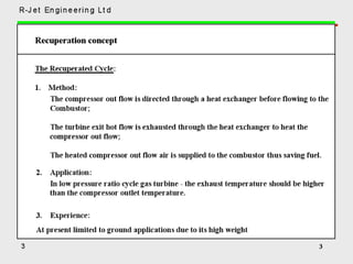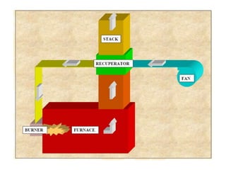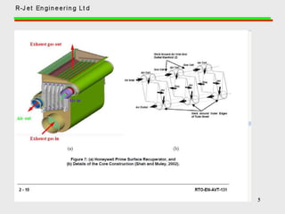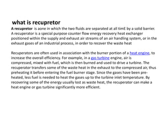 A recuperator is a heat exchanger that recovers waste heat from exhaust gases or air streams and transfers it to incoming gases or air streams. It increases efficiency by preheating the incoming streams using waste heat from the outgoing streams. Recuperators are commonly used in industrial processes and gas turbine engines to reduce fuel consumption and increase overall efficiency. They can reduce energy costs by recovering up to 80% of waste heat and lowering fuel usage by 20-30%.