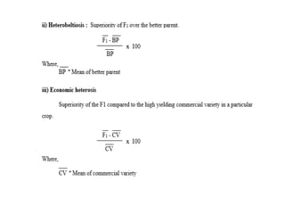 This document discusses recurrent selection, which is a breeding method used to improve cross-pollinated crops. It involves selecting single plants based on their phenotypes over multiple generations of selfing and intermating. There are different types of recurrent selection including simple recurrent selection, recurrent selection for general combining ability, and reciprocal recurrent selection. The document also discusses heterosis, inbreeding depression, hybrids, and methods for producing hybrid crops.