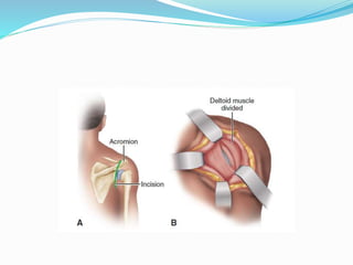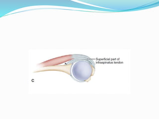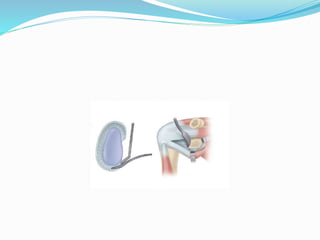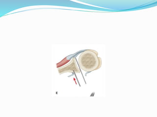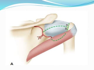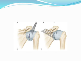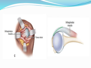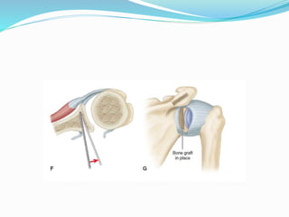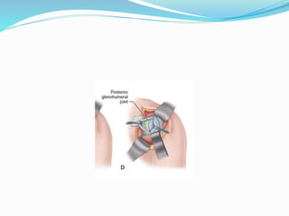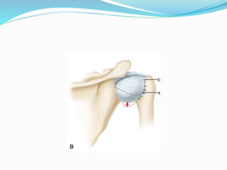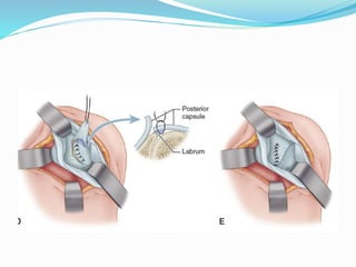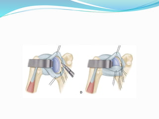 This document discusses the anatomy, biomechanics, classification, diagnosis and treatment of shoulder instability. It begins with an overview of the normal shoulder anatomy including the glenoid, labrum, joint capsule, glenohumeral ligaments and muscles. It then covers types of shoulder instability, factors that influence recurrence, physical exam tests and classification systems. Treatment options discussed for anterior instability include modified Bankart repair and Latarjet procedure. Posterior instability is also reviewed.