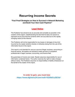 The document discusses the concept of recurring income, particularly focusing on network marketing as a viable means of achieving it. It outlines the different types of income, advises on choosing a network marketing company with a strong track record, and offers insights into successful strategies in the field. Furthermore, it emphasizes the importance of training and support in overcoming common pitfalls faced by network marketers.