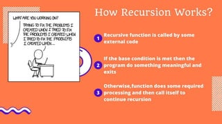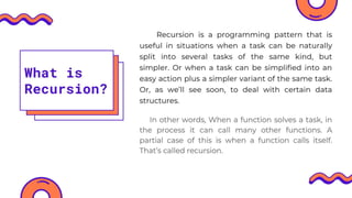 The document discusses recursion in Python, providing various resources and links for understanding and implementing recursive functions. It includes tutorials, examples, and practical applications to help beginners grasp the concept effectively. The compilation aims to facilitate learning through multiple perspectives and formats.