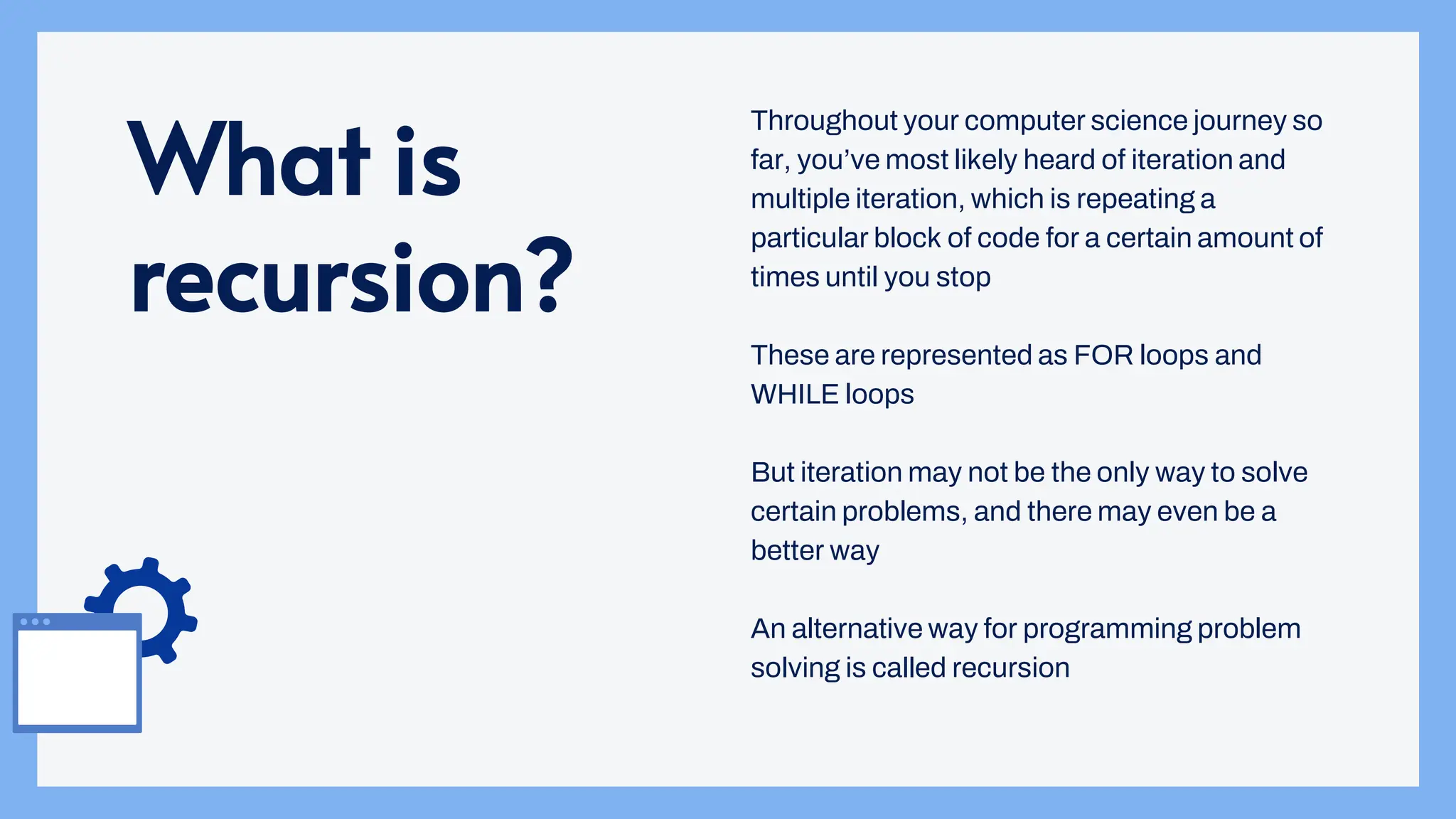 This document provides an introduction to recursion in computer science. It explains that recursion is when a function calls itself, and gives an example of writing a recursive function to calculate the factorial of a number. The factorial function takes a number as a parameter, has a base case where it returns 1 if the number is 1, and recursively calls itself with the number-1 parameter while multiplying the return values to calculate the factorial.