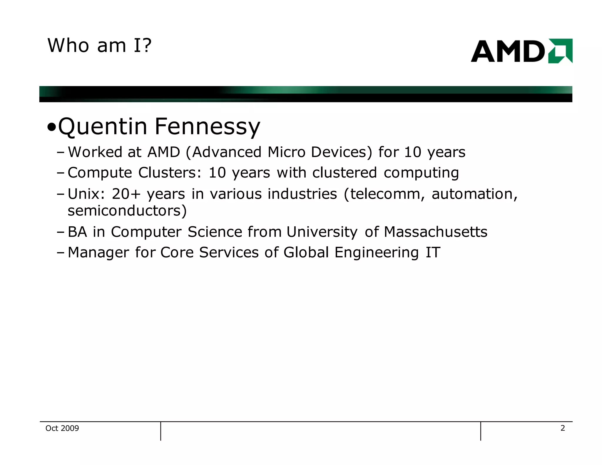The document outlines the evolution and management of AMD's compute clusters, highlighting their use in developing microprocessor designs efficiently. It details historical transitions in hardware and software, challenges faced, and best practices for management. Additionally, it includes statistics on cluster size, job types, and system performance improvements over time.