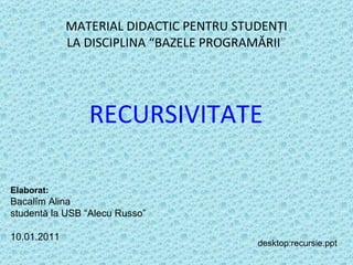 Documentul prezintă conceptul de recursivitate în programare, explicând definiția și importanța acesteia în rezolvarea problemelor complexe. Recursivitatea este definită prin subprograme care se autoapelează, iar documentul detaliază tipurile de recursivitate: directă și indirectă. Un exemplu ilustrativ al utilizării recursivității este calcularea factorialului unui număr natural.