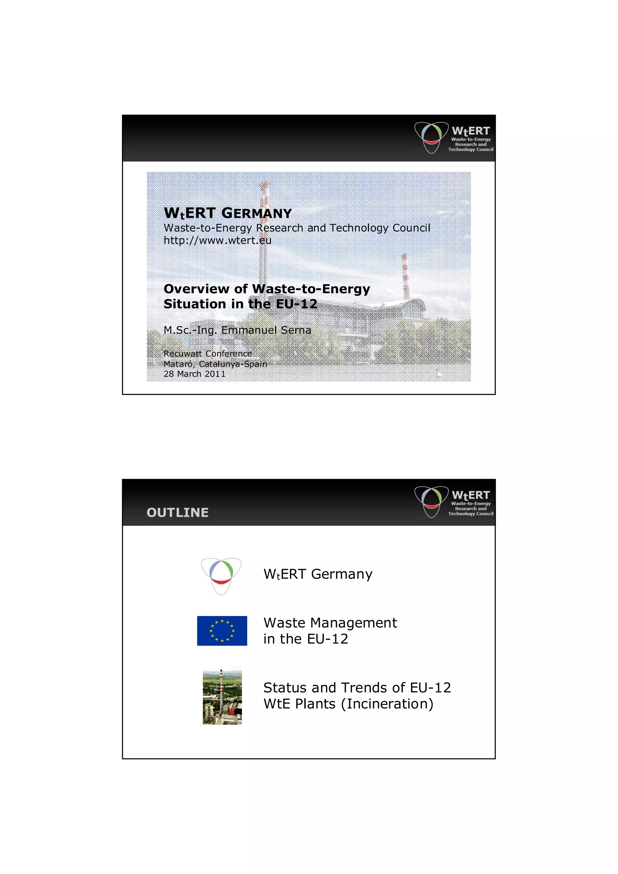 The document provides an overview of the waste-to-energy (WTE) situation in the EU-12 as presented by the WTERT Germany Council at the Recuwatt Conference in 2011. It discusses trends in waste management, the historical context and objectives of WTERT, and details the status of various WTE plants, including future projects across several Member States. Additionally, it highlights the legislative framework guiding waste management practices in the EU, including directives aimed at promoting recycling and reducing landfill use.