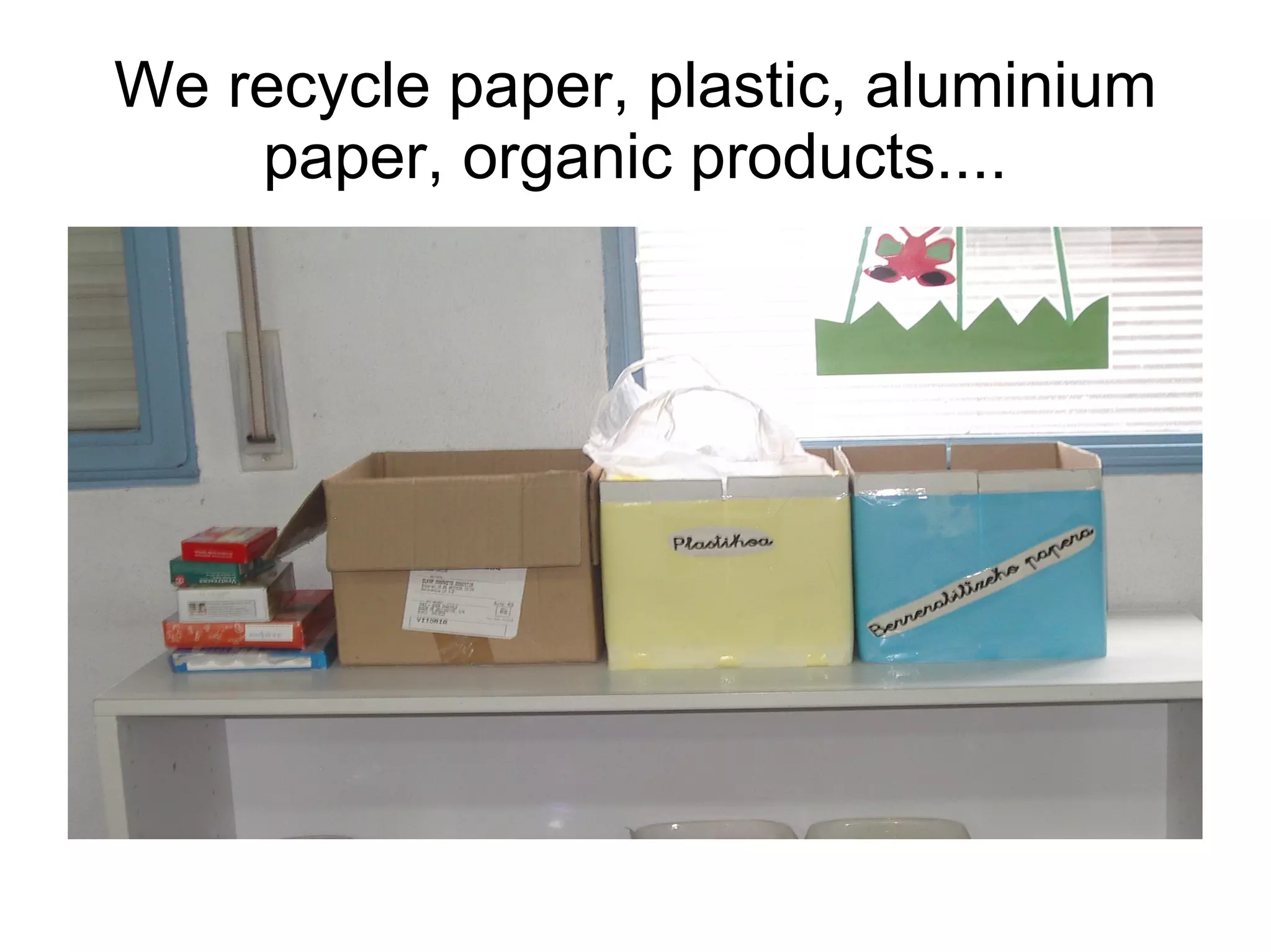 The document discusses recycling at a school. It finds that while some recycling bins exist in the first and second cycles, there are none in the third cycle. Recycling is also mixed together in the playground. The cleaning staff then puts all rubbish together. Some suggestions to improve recycling at the school include giving lessons on recycling, placing each product in the proper bin, launching a recycling campaign, and adding plastic recycling bins to the third cycle. It also asks students if they recycle at home and what they think of doing a recycling information campaign.